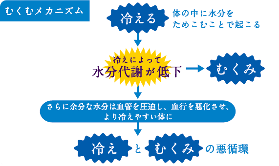 ●冷えがあると水分代謝が悪くなり、体内に水分を溜めこんでしまいます。●さらには、血管外の余計な水分は血管を圧迫し、血行を悪くしてしまうため、より冷えやすくなり、むくみと冷えの悪循環に陥ります。●手足などの末端は心臓から遠く、血流が悪くなりがちなため、むくみが現れやすい場所です。●とくに冷えやすい女性の場合、体温を逃がさないよう血管が収縮し血行が悪くなり、むくみが現れ、太く見えてしまうことに。 -