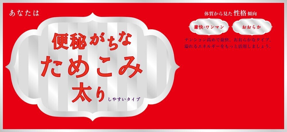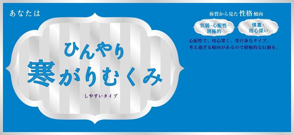 考え過ぎる傾向があるので積極的な行動を。●漢方的には、血虚(血が足りない)で、カラダに栄養がまわらず、本来、血で満たせるところに、水が入って溜め込み、冷え込むタイプの人です。●そういう人は、やや受け身で心配性。細かなことで、クヨクヨ考えすぎることが多くないですか?用心しすぎる一面があり、結局、何もしないで終わる傾向があります。●むくみ対策では、自分が良いと思うことは、積極的に取り組んでみてはいかがでしょう。