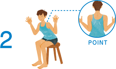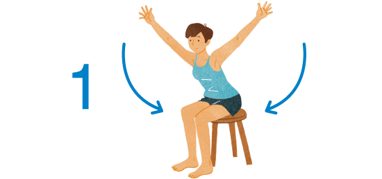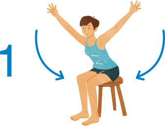 1.椅子に浅めに座り、足は腰幅に。姿勢を正し、背骨を曲げないように股関節から上体を前に倒す。両手はバンザイのポーズ。肘を曲げないこと。
