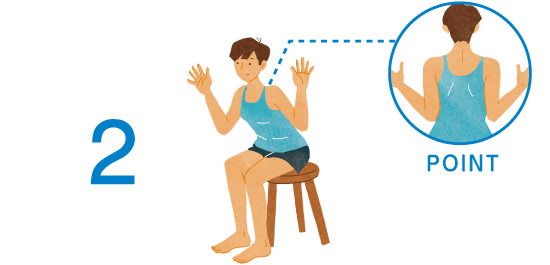 2.目線は斜め前方に。下腹部に力を入れたまま、息を吸い、吐きながら肩甲骨を寄せ合うよう、両手を斜め下(肘を体に近づけるように)にゆっくり引き寄せる。頭は下げず、腰も反らさないで。息を吐ききったら、吸って1のバンザイポーズに戻す。1、2をゆっくり繰り返して10~15回。