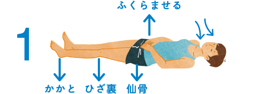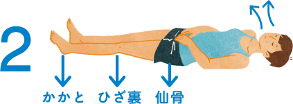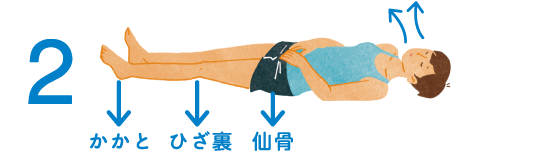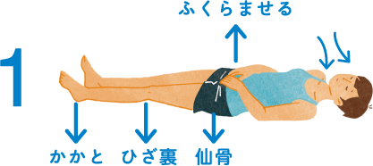 2.息を入れた分だけ、口から自然に少しずつ吐いていく。吐くときも「仙骨、ひざ裏、かかとの3点がずれないように」と思いながら、吸うときの倍の時間をかける。1、2を3回繰り返す。