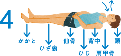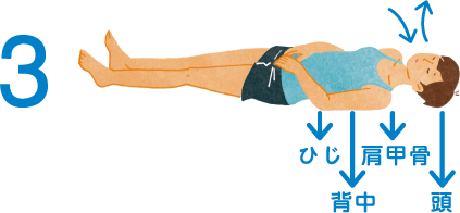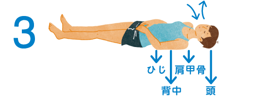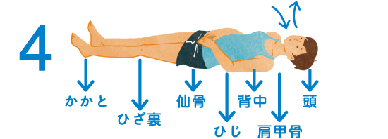 3.今度は「頭、肩甲骨、肘、背中の4点が動いたり、浮いたり、ずれたりしないように」と思いながら、手を乗せている下腹部を少しずつふくらませ、鼻からゆっくりとやさしく息を吸う。続いて、吸った倍の時間をかけ、口から勝手に息が出ていく感じに吐く。この時も、4点が動いたり、ずれたり、浮いたりしないようにと思い、吸う吐くを3回繰り返す。