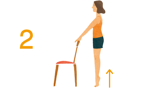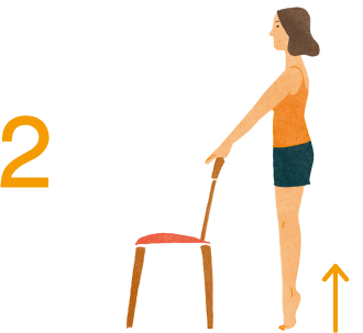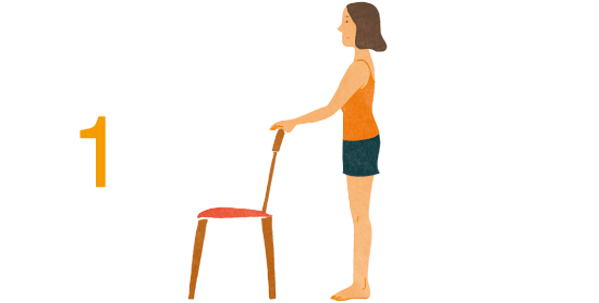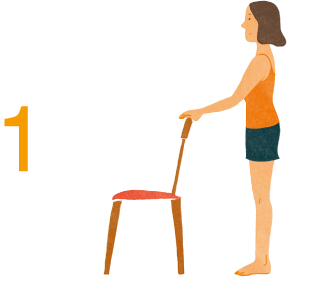 1.両足を腰幅に開き、支えにする椅子などの背もたれを持って立つ。肩に力を入れず、呼吸は自然に。