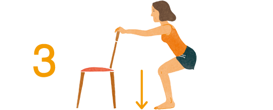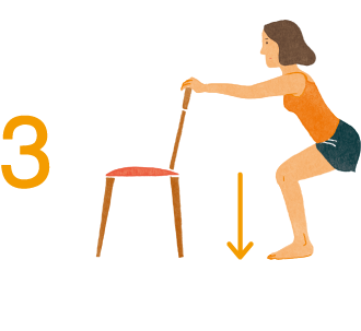 3.かかとを下ろし1の状態に戻したら、そのままゆっくり腰を下ろす。膝がつま先より前に出ないよう注意。背筋が丸まらずに腰を落とせるところまで低く落とし、3秒キープ。目線は前へ。ゆっくり1の状態に戻し、繰り返し10~15回。