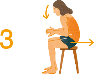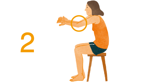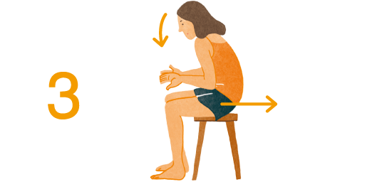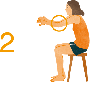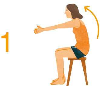 1.椅子に浅めに座り、足は腰幅に開く。両手を合わせて前に出し、背中を緩めて丸くする。肩甲骨から腕を前に移動させる感覚で。