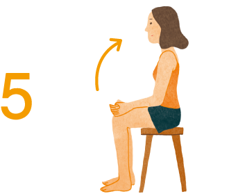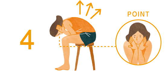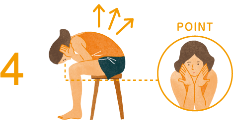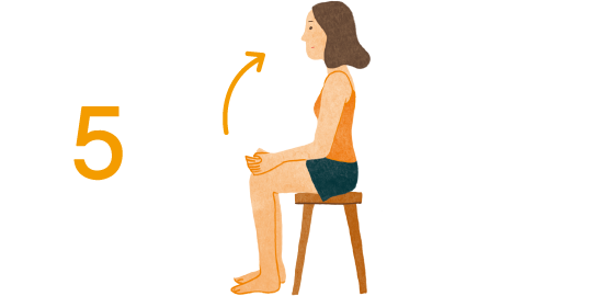 5.ゆっくり鼻から息を吸いながら体を起こし、両手はももの上。次の吐く息で腕を楽にしたら、1回深呼吸。1~5を3~5回繰り返す。