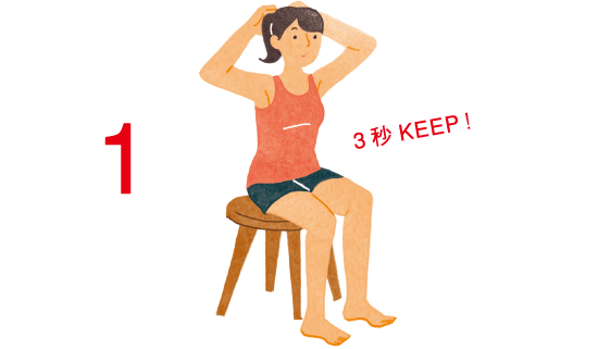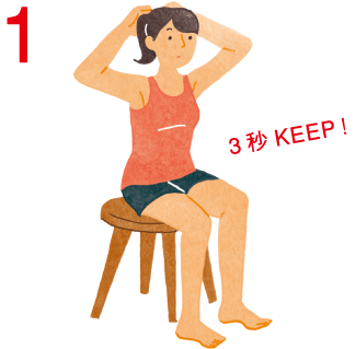 1.椅子に浅めに腰掛け、両手は頭を軽く支えるようにする。お腹をしっかり凹ませて息を吐ききり、3秒キープ。吐くときは、ろうそくの火を消すようなイメージで。