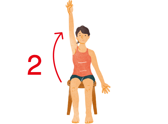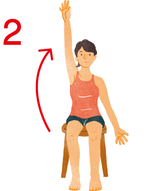 2.息を吸いながら、2、3秒かけて右手が体の遠くを通るように弧を描いて上げる。この時、おへその下、下腹部は凹ませておき、脇腹の筋肉を使って手を上げるイメージ。