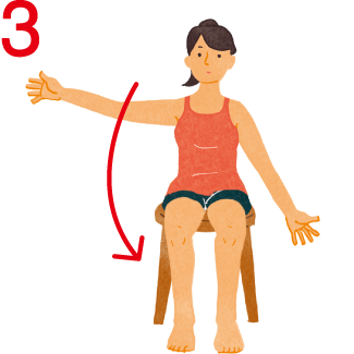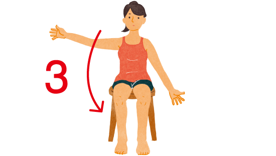 3.右手を挙げきり息を吸いきったら、今度は息を吐きながらその手を6秒ほどかけて1の位置に戻す。この時、顔と骨盤の位置は動かさない。息を吐ききったら今度は左手。左右交互に3~10回。