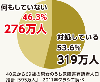 全国の40歳から69歳までの人口は、5,116万人。そのうち尿障害有訴者人口は、「推計595万人」です。しかし、対処者は319万人。多くの人が症状を自覚していても、約半数の人が何もせず、対処できていないという現状があります。(以上、2011年クラシエ調べ)