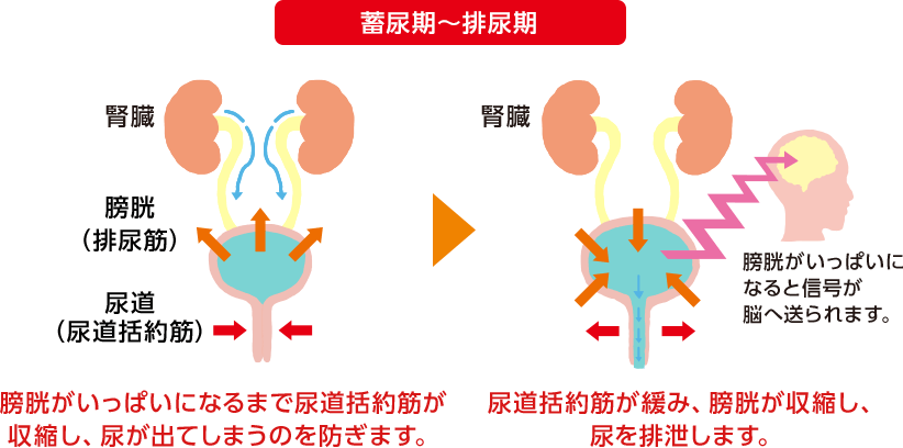 また、脳ヘの排尿信号が過敏になり、尿が少ししか溜まってないのに尿意をもよおして卜イレに行きたくなったり、尿に関するホルモンが上手く分泌できず、尿の量をコントロールできなくなったりすることも要因のひとつです。これら、様々な要因が絡み合い、頻尿や残尿感、軽い尿漏れ、夜間尿などが発生します。特に加齢によって、蓄尿~排尿機能の低下を感じることが多々あります。