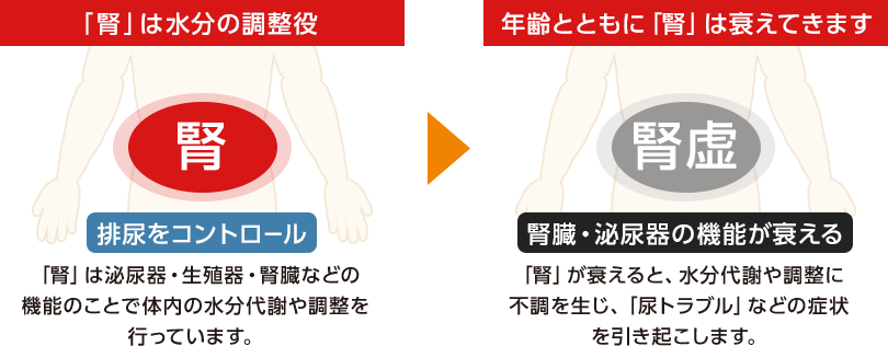 泌尿器・生殖器・腎臓などの機能を「腎」と呼び、この「腎」の機能が低下したり、不足している状態が「腎虚 (じんきょ) 」です。漢方では、尿トラブルは「腎虚」による症状だと考えます。人は年齢を重ねるにつれ、からだを温めるエネルギーと潤いが失われていくと考えられ、これらが失われていくことにより、からだが冷える、疲れやすい、腰痛、かすみ目、頻尿・夜間尿・軽い尿もれなどの尿トラブルにつながっていきます。この「腎虚」を改善し、尿トラブルに効果のある処方が「八味地黄丸」です。文字どおり、8種類の生薬の働きで水分代謝の改善や血液循環の促進、さらに全身を温めて新陳代謝をスムーズにして、尿トラブルを改善していきます。さらに、かすみ目や腰痛など、加齢に伴う症状を複合的に改善できる処方です。
