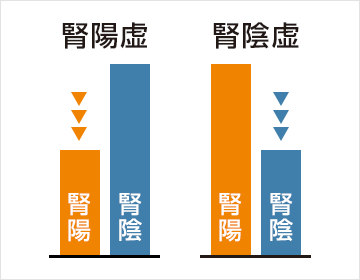 もうひとつは、体をうるおわせ、栄養をあたえる「腎陰」です。腎気そのものが充実しているだけでなく、この2つのバランスも大切です。腎陰に比べて腎陽が不足している状態を「腎陽虚」といい、腎陽に比べて腎陰が不足している状態を「腎陰虚」といいます。
