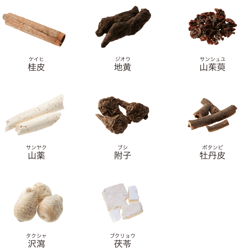 「腎陽」とは身体を温めたり機能させたりするエネルギーの大元のこと。つまり八味地黄丸は、全身を温めて泌尿器や生殖器・腎臓の機能を高め、機能低下によって生じるさまざまなトラブルを改善する漢方です。からだを温める生薬をメインに8種類の生薬で構成され、腎陽虚の人に起こりがちな、さまざまな症状に効果的です。