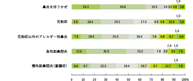 「花粉症」などのアレルギー性鼻炎については、かぜよりも症状を訴える期間は長めで、5割近くの医師が、「1週間以上4週間未満」を目安と考えているようです。長期の症状の場合は、こうした花粉症などのアレルギー性鼻炎を疑ってみる必要がありそうです。