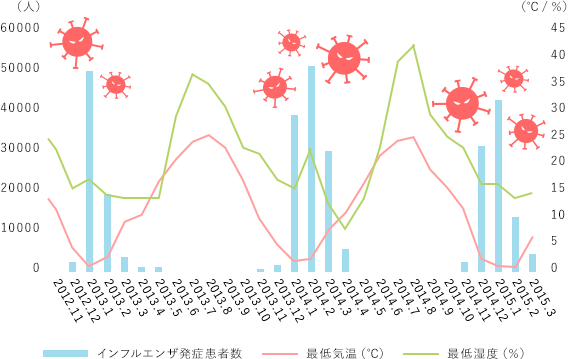 手足口病やプール熱といった夏かぜの例を除くと、かぜの流行は冬に見られます。それは、かぜを引き起こすウイルスの多くが、15〜18℃の低温かつ乾燥した環境で威力を発揮する性質を持っているため。特にインフルエンザは、一般的なかぜのウイルスに比べて、ウイルスの増殖スピードが早いので、流行の規模も大きくなりがち。インフルエンザは気温が下がり始めた12月前後から発生が始まり、1〜3月にピークとなる傾向にあります。