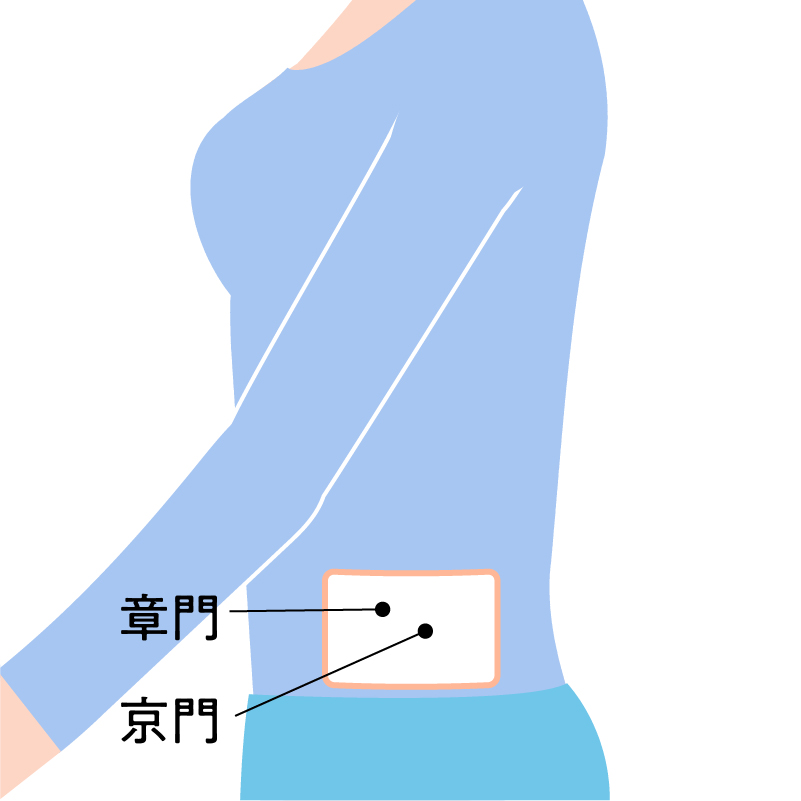 わき腹にある「京門(けいもん)」や「章門(しようもん)」といったツボは、胃腸の調子を整え、ウイルスを跳ね返す。左右に1枚ずつ貼って。
