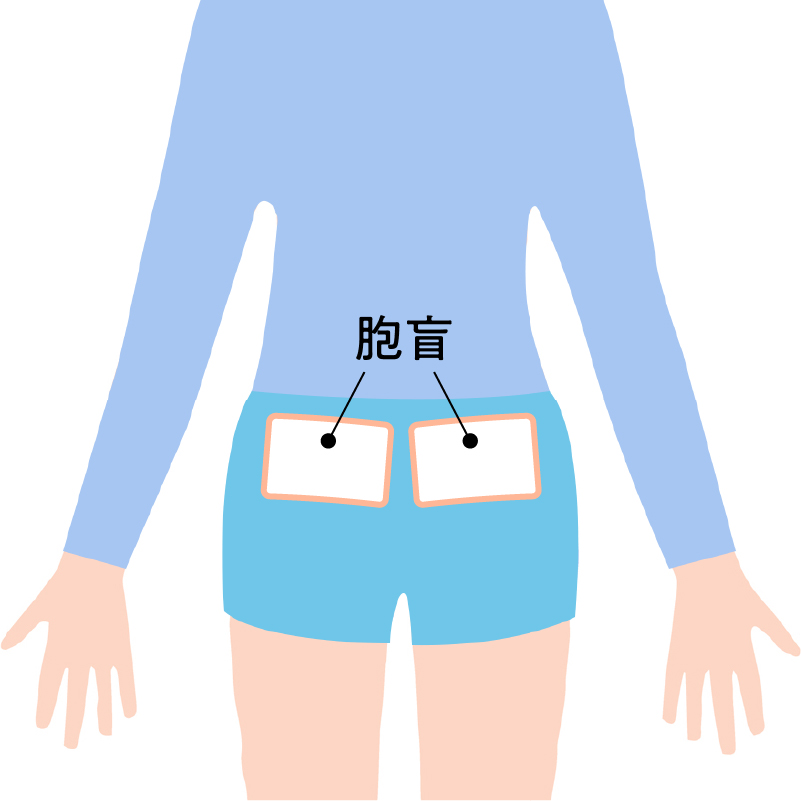 腰骨とお尻の肉の境目にある「胞盲(ほうこう)」というツボの上に、左右それぞれ1枚ずつ貼って。