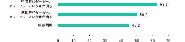 気管支ぜんそくと思われる症状であがったのが、「呼吸時にゼーゼー、ヒューヒューという音が出る」「呼吸困難」。これ以外に目安となるせきの症状として、「発作性のせき込みがある」「せきが頻発する」「激しくせき込む」などがあげられています。こうした症状が起きたときに、医師は気管支ぜんそくの可能性を考えるようです。