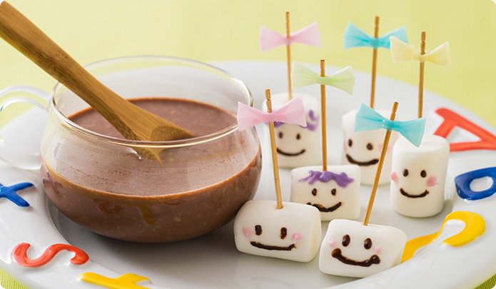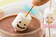 これを❷に入れてよく混ぜ、口の広い容器などに注ぐ。 - ❹❶のマシュマロを❸につけながら食べる。