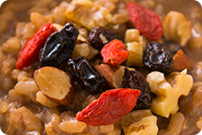 - ❹❸を器に盛り、上にアーモンドやくるみを細かく刻んだもの、レーズン、クコの実をのせる。