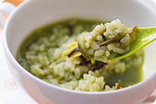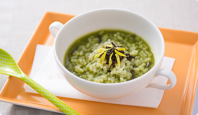 花粉症のお子様のために、抗アレルギー効果が期待できる抹茶を使ったお粥です。抹茶の良い香りが楽しめるうえに、リラックス効果もあります。お粥なら抹茶に含まれるカフェインもごく少量。決め手に塩昆布を加えることで、日本人に馴染みのある優しい塩味に仕上がり、食欲のないお子様にも食べやすくなります。