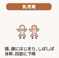 幼児期、小児期、成人期と年齢とともに皮膚の湿疹は変化していきますが、広範囲に皮膚炎が及んでいることがほとんどです。また、左右対側性(左右とも似た部位に発症する)であり、好発部位は、前額、眼囲、口囲、口唇、耳介周囲、頚部、四肢関節部、体幹です。