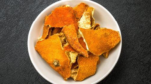 陳皮はミカンの皮を乾燥させたもので、血気の循環を促進し、四肢を温め、心を癒してくれます。食欲の改善にも役に立つ水分代謝に良い食材ですので、体の余分な水分をとり、毎日食べることにより体は軽くなります。また、せきやたんを抑えるはたらきが期待できます。