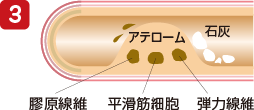 さらに弾力線維や平滑筋細胞などが増殖し線維芽細胞の土台を固めます。脂肪分や石灰成分が沈着し、血液の塊も付着するなどして動脈硬化となります。