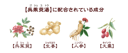 漢方の「呉茱萸湯(ごしゅゆとう)」には温中降逆(おんちゅうこうぎゃく)・暖肝散寒(だんかんさんかん)という作用があるとされており、合わせて温中散寒の作用となります。