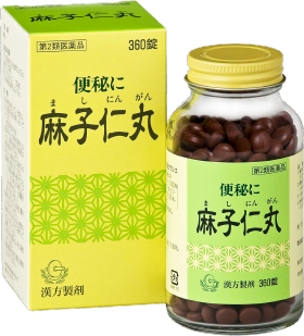 ●「麻子仁丸[マシニンガン]」は、漢方の古典といわれる中国の医書『傷寒論[ショウカンロン]』に収載されている薬方で、主薬の麻子仁をはじめ杏仁[キョウニン]・大黄[ダイオウ]など6つの配合生薬からなる漢方処方です。