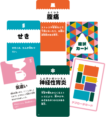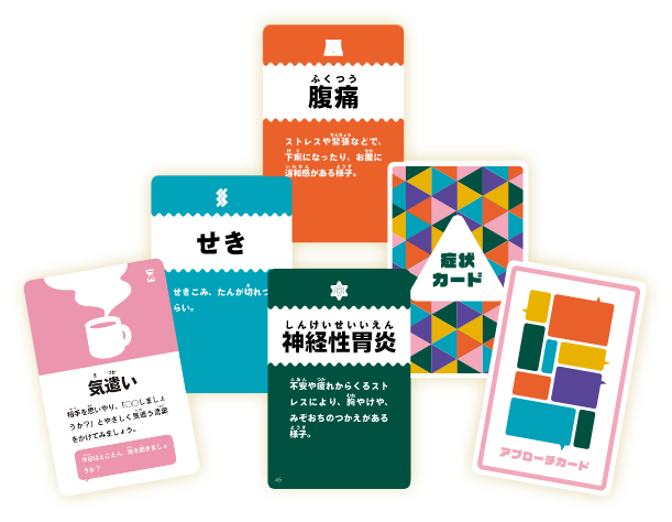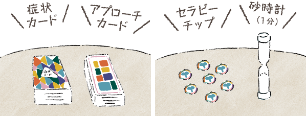 症状カード 45枚 / アプローチカード 9枚 / 砂時計 /