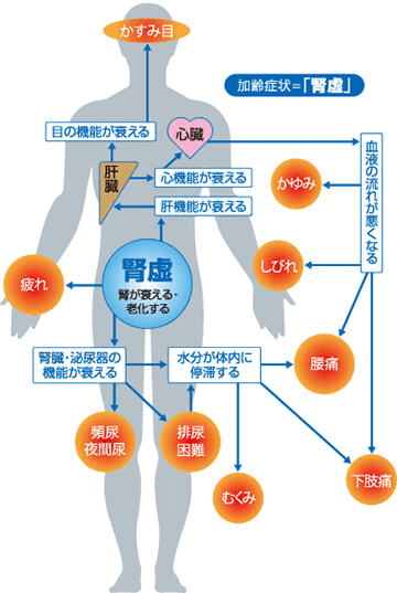 「腎」は、身体の様々な機能に密接に関わっており、「腎虚」になると様々な衰えの症状が現れるようになると考えております。