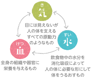 漢方では、人の体は「気(き)」「血(けつ)」「水(すい)」の3つで構成されていると考えられています。「気」は目には見えないが人の体を支えるすべての原動力のようなもの、「血」は全身の組織や器官に栄養を与えるもの、「水」は飲食物中の水分を消化吸収によって人の体に必要な形にして体をうるおすもののことです。この3つは、お互いに影響しあっています。