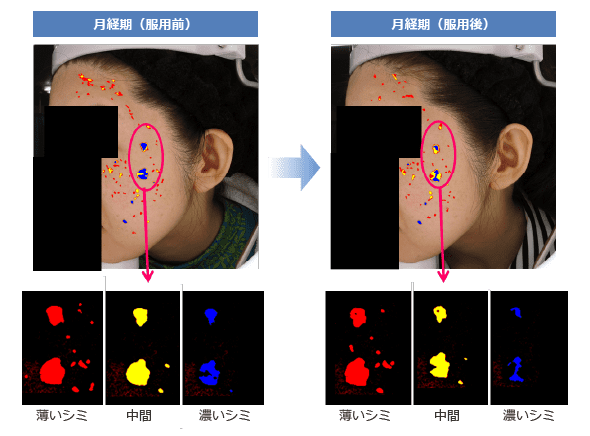 月経初日から次の月経期まで「クラシエ」漢方桂枝茯苓丸料加薏苡仁エキス錠(4錠×2回/日)を服用し、定期的に顔面の色素沈着評価を全顔画像撮影解析システム(ロボスキンアナライザ™)を用いて行いました。