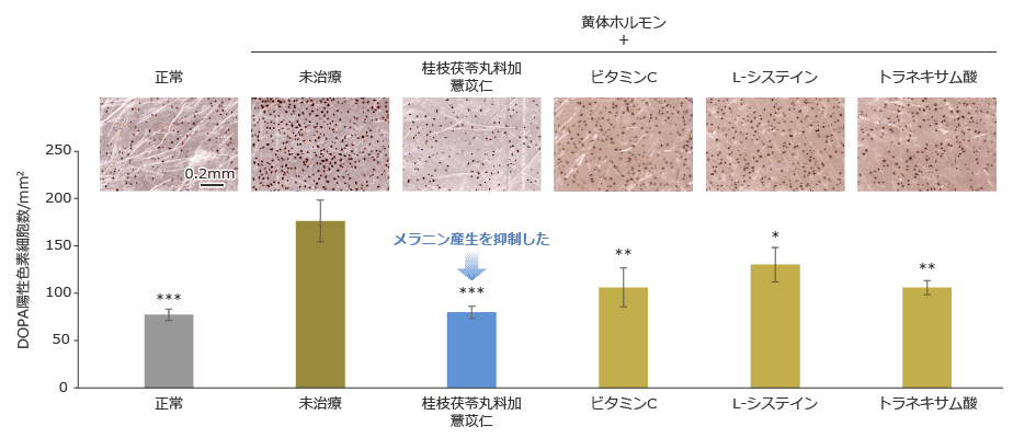 黄体ホルモンをマウスに腹腔投与しながら、各薬剤を20日間経口投与し、21日目に耳の表皮の色素産生細胞数(Dopa陽性メラニン産生細胞)を比較しました。本試験では「クラシエ」漢方桂枝茯苓丸料加薏苡仁エキス錠に使用しているエキスを投与しました。