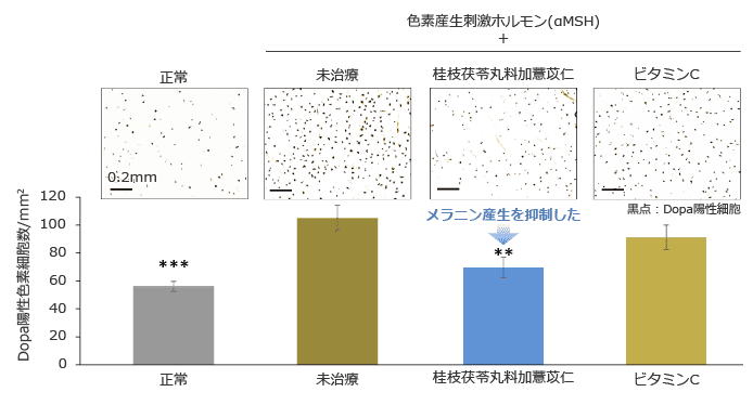 αMSHを腹腔投与しながら各薬剤を5日間経口投与し、6日目に耳の表皮色素産生細胞数(Dopa陽性メラニン産生細胞)を比較しました。本試験では「クラシエ」漢方桂枝茯苓丸料加薏苡仁エキス錠に使用しているエキスを投与しました。