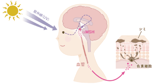 紫外線によるシミ対策の基本は、日焼け止めやUVブロックウェアを使って、肌を紫外線から守ることですが、目に紫外線が当たることも、全身のシミやそばかすの原因となることが知られており、以下のようなメカニズムが明らかとなっています(J Invest Dermatol. 2003, 120:123-7)。
