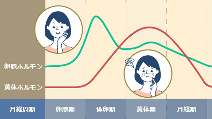 黄体期(排卵後から次回の月経までの約2週間程度)においては、黄体ホルモンが分泌され、体温は高温になり、体重増加、むくみ、イライラ、眠気、そして、シミやニキビを含む肌荒れが起きやすくなります。同じ現象が、妊娠期や月経不順においては強めに起きるため、その時期の肌荒れやシミが増えることがあると報告されています(J Invest Dermatol. 1966 47:147-55)。