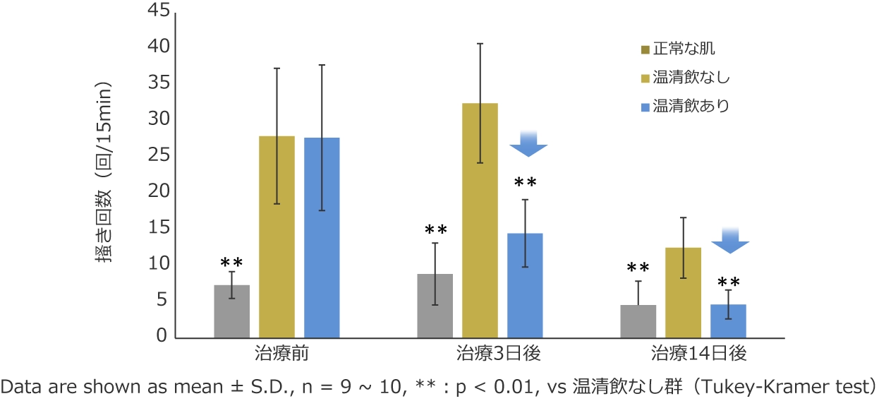 3回塗布後、温清飲(1000mg/kg)を2週間飲ませた群と、飲ませていない群に分け、かゆみ(掻く回数)及び肌状態を比較しました。