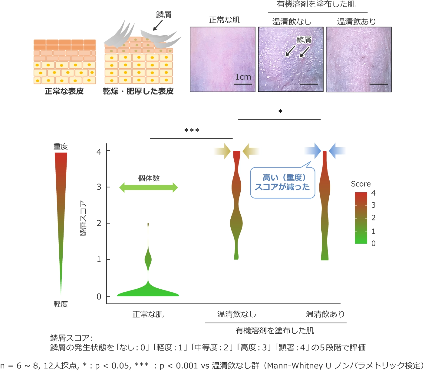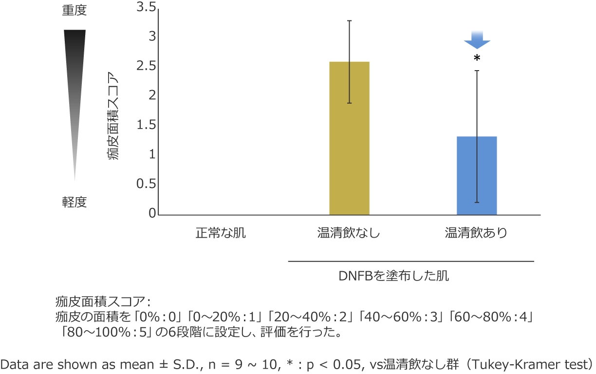 有機溶剤を塗布すると、顕著な鱗屑の発生がみられましたが、温清飲のを服用することで鱗屑の発生を抑制していました。