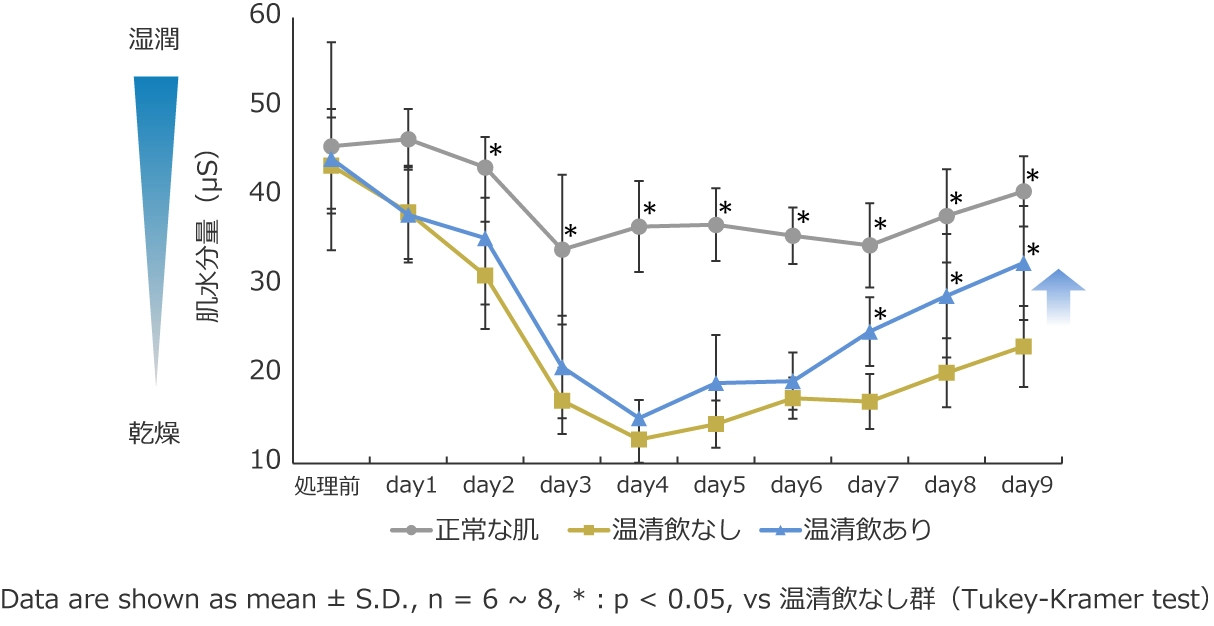 有機溶剤を塗布すると、肌水分量が減少して乾燥が進んでいましたが、温清飲を服用することで、早期に肌水分量が回復し、乾燥が改善されました。