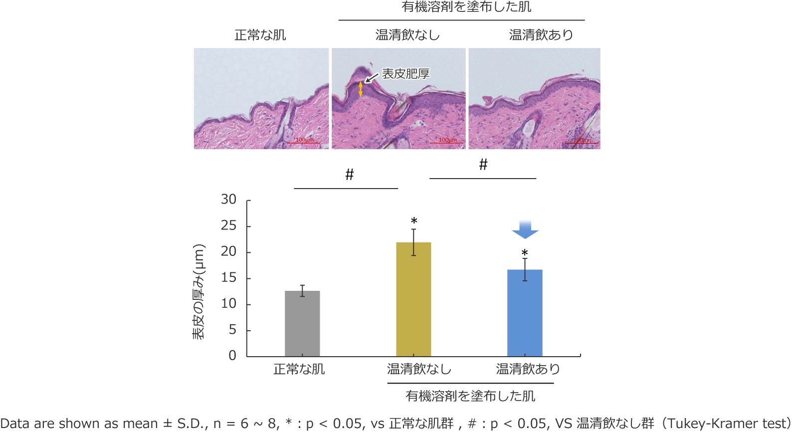 有機溶剤を塗布すると、表皮が厚くなっていましたが、温清飲を服用することで、表皮の厚みが改善しました。