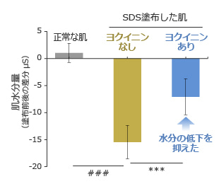 SDSを塗布すると、肌水分量が低下し乾燥が進んでいましたが、ヨクイニンエキスを飲ませていると、水分の保持が認められ、肌の乾燥を防ぎました。