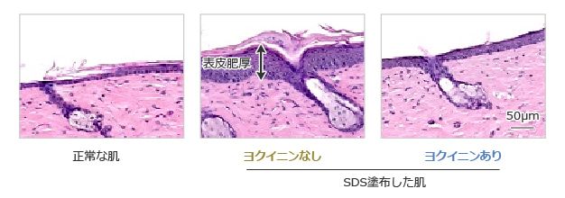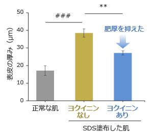 SDSを塗布すると、表皮が約2倍に厚くなっていましたが、ヨクイニンエキスを飲ませていると、厚みの上昇を抑制しました。