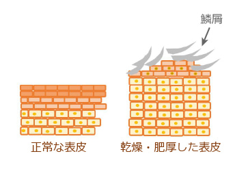 乾燥や皮脂不足で、肌の角層がかさかさとして剥がれ落ちたものや肌あれで粉ふき状になっているもの。
