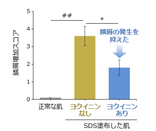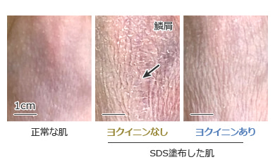SDSを塗布すると、顕著な鱗屑の発生がみられましたが、ヨクイニンエキスを飲ませていると、鱗屑の発生を効果的に抑制しました。