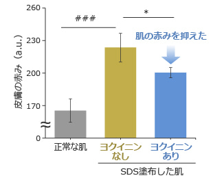 SDSを塗布すると、肌の赤みが顕著に上昇しましたが、ヨクイニンエキスを飲ませていると、赤みの発生を軽減しました。
