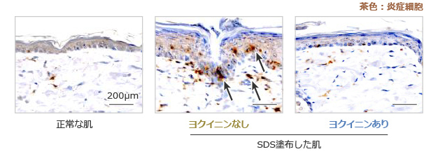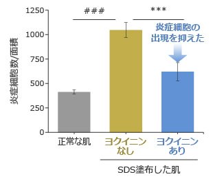 SDSを塗布すると、表皮周辺の炎症細胞数が顕著に増えましたが、ヨクイニンエキスを飲ませていると、その数は減少しました。