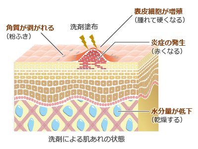 洗剤や石鹸などに含まれる界面活性剤は、過剰な皮脂や汚れを落とす作用がありますが、使用しすぎると、肌のバリア機能が失われ、肌が刺激を受けやすくなります。このため、肌が赤くなったり、腫れて固くなったり、粉ふき状に角質が剥がれたり、肌の乾燥が進むなど、肌あれの症状を引き起こします。